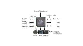 O documento descreve o que é um chipset, suas principais funções e como é dividido em duas partes - ponte norte e ponte sul. O chipset controla a comunicação entre os principais componentes do computador como CPU, memória e periféricos.