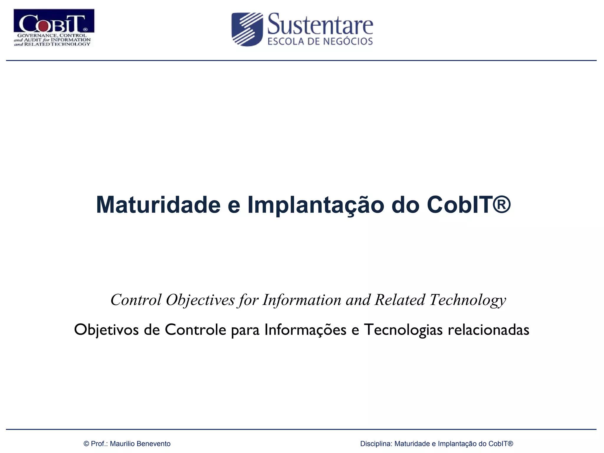 O documento explora a maturidade e a implantação do COBIT, um modelo de boas práticas para governança de TI, criado pela ISACA, que visa otimizar investimentos, assegurar serviços e prover métricas. Trata também da importância da governança corporativa, abordando princípios fundamentais, categorias de propriedade e o papel dos conflitos de agência. O COBIT é apresentado como essencial para o gerenciamento de risco, controle e alinhamento das operações de TI com a estratégia organizacional.