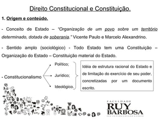 O documento discute o conceito de direito constitucional e constituição. Apresenta diferentes definições de constituição e classificações das mesmas de acordo com origem, forma, extensão, conteúdo, modo de elaboração, alterabilidade, correspondência com a realidade e finalidade. Explora também a origem do constitucionalismo e seu desenvolvimento ao longo da história.