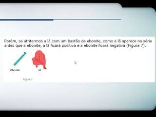 O documento discute os conceitos básicos de eletrostática, incluindo a natureza da eletricidade, átomos, moléculas, carga elétrica, eletrização por atrito e indução. Explica que a matéria é composta por átomos formados por núcleos e elétrons, e que a eletricidade surge quando há desequilíbrio na distribuição de cargas entre corpos.