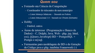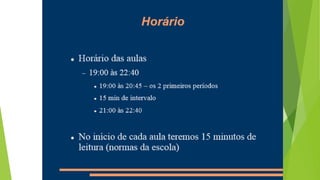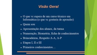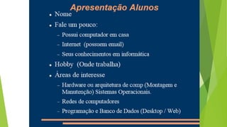 Este documento apresenta as formas de avaliação de um curso incluindo trabalhos individuais e em grupo, provas escritas, participação em aulas e frequência. Também descreve a ementa de um curso introdutório sobre HTML, incluindo tópicos como estrutura básica, cabeçalhos, parágrafos, cores, imagens, listas e links.