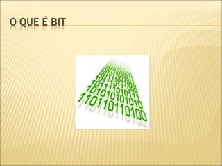 O computador processa informações eletronicamente em forma de dados, recebendo entrada de dados, processando-as e gerando saída de dados. Ele é composto por hardware, a parte física, e software, os programas necessários para realizar tarefas. Os computadores trabalham com códigos binários de 0s e 1s, chamados bits, que formam bytes para armazenar caracteres, números ou símbolos.