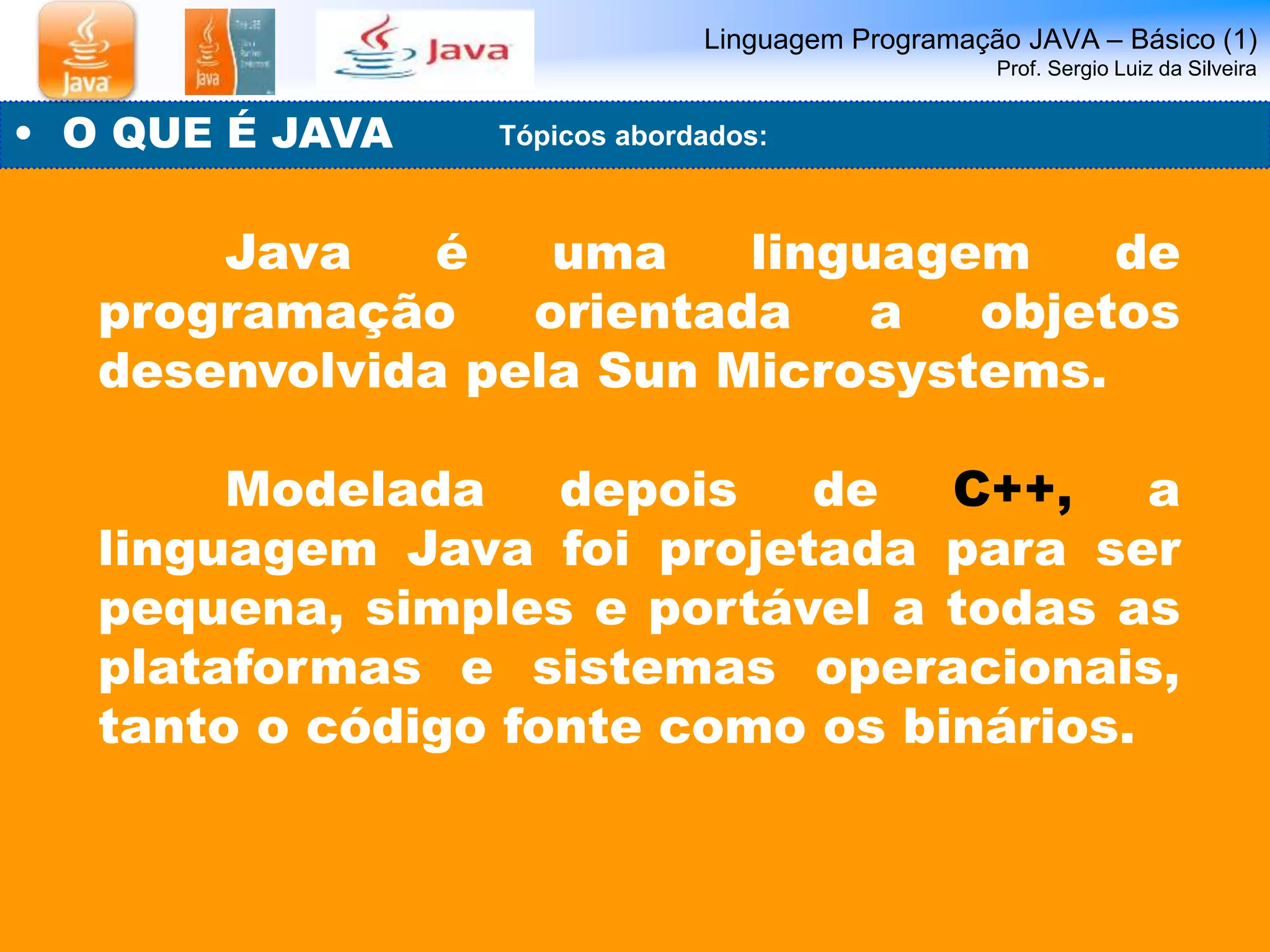 O documento apresenta uma introdução básica à linguagem de programação Java, descrevendo sua natureza orientada a objetos e portabilidade, as principais edições e elementos do universo Java, incluindo JDK, JRE, JVM e API. O autor é o professor Sérgio Luiz da Silveira.