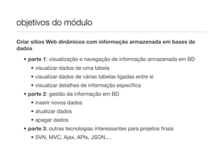 Este documento apresenta os objetivos e etapas para criar sites dinâmicos com PHP e MySQL. Os objetivos incluem visualizar, inserir, atualizar e apagar dados armazenados em bancos de dados. As etapas são: 1) estabelecer ligação ao MySQL, 2) escolher banco de dados, 3) extrair dados através de queries, 4) preparar dados para PHP, 5) mostrar dados, 6) fechar ligação.