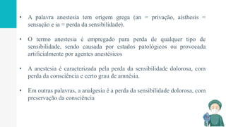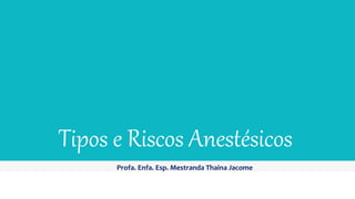 O documento discute os tipos e riscos de anestesia. Resume os principais pontos abordados: 1) Existem diferentes tipos de anestesia como geral, regional e local; 2) A anestesia geral pode ser inalatória, intravenosa ou balanceada e requer monitoramento cuidadoso; 3) A anestesia regional inclui raquianestesia, peridural e bloqueios de nervos e tem menos riscos que a geral.