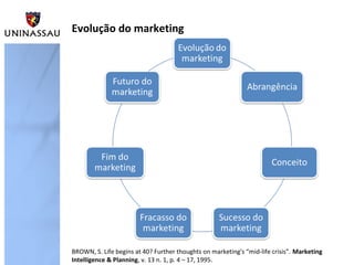Este documento discute conceitos básicos de marketing, incluindo definições de marketing, necessidades versus desejos, valor para o cliente, e ferramentas de marketing como os 4Ps, 4Cs, 4As e 4Es. Ele fornece uma introdução abrangente aos principais tópicos e termos relacionados ao marketing.