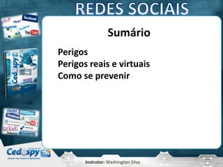 O documento discute os perigos dos sites de redes sociais como o Facebook. Um estudo mostrou que 35% dos usuários clicaram em um link malicioso em uma mensagem privada, colocando suas contas e dados em risco. Além disso, muitos usuários compartilham informações pessoais com estranhos online, revelando dados valiosos como endereços e datas de nascimento. O documento também fornece dicas sobre como se proteger melhor nessas redes.