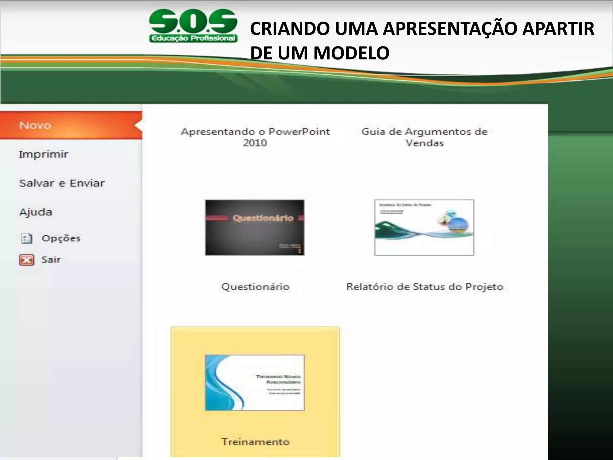 O documento fornece instruções sobre como criar e editar uma apresentação no PowerPoint, incluindo como alterar o tema, estilos de plano de fundo, excluir e reordenar slides, editar conteúdo de slides, alterar marcadores, adicionar novos slides, inserir imagens e clipart, e apresentar a apresentação.