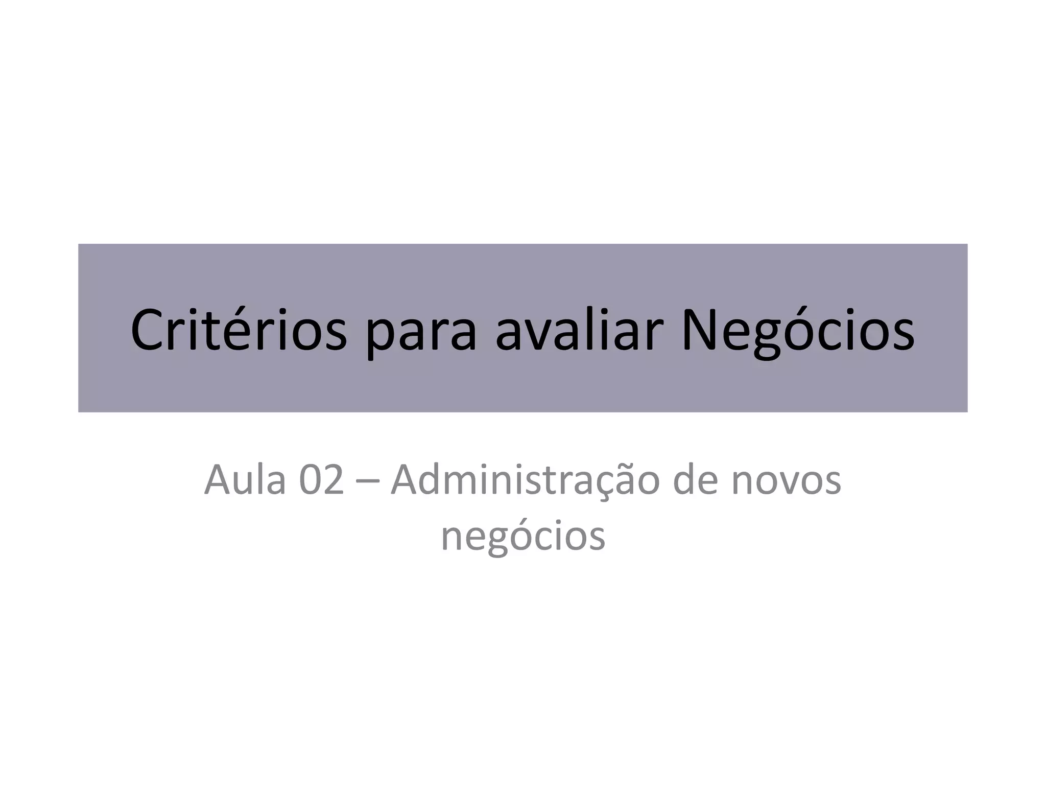 O documento fornece critérios para avaliar a viabilidade de novos negócios, incluindo analisar a viabilidade do mercado, concorrência, produção, requisitos governamentais e investimento inicial necessário. Deve-se selecionar ideias de negócios mais promissoras e realizáveis e considerar a opinião de outras pessoas.