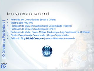 Este documento apresenta um resumo das principais informações sobre o Direito Brasileiro e a regulamentação da publicidade no Brasil de acordo com a Constituição Federal. Ele descreve a hierarquia das normas jurídicas no Brasil, com a Constituição no topo, e detalha os artigos da Constituição que tratam especificamente da comunicação social e publicidade, estabelecendo diretrizes e limites para essas áreas.
