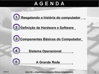 O documento resume a história dos computadores desde os primeiros dispositivos mecânicos de contagem até os computadores modernos, descrevendo marcos como a criação do ENIAC, do IBM PC e do Macintosh. Também aborda conceitos básicos como hardware, software, sistemas operacionais e componentes de um computador como gabinete, monitor e memória.