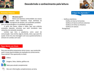 1) O documento apresenta os principais tipos de gráficos estatísticos como barras horizontais, barras verticais, linhas, setores e pictogramas.