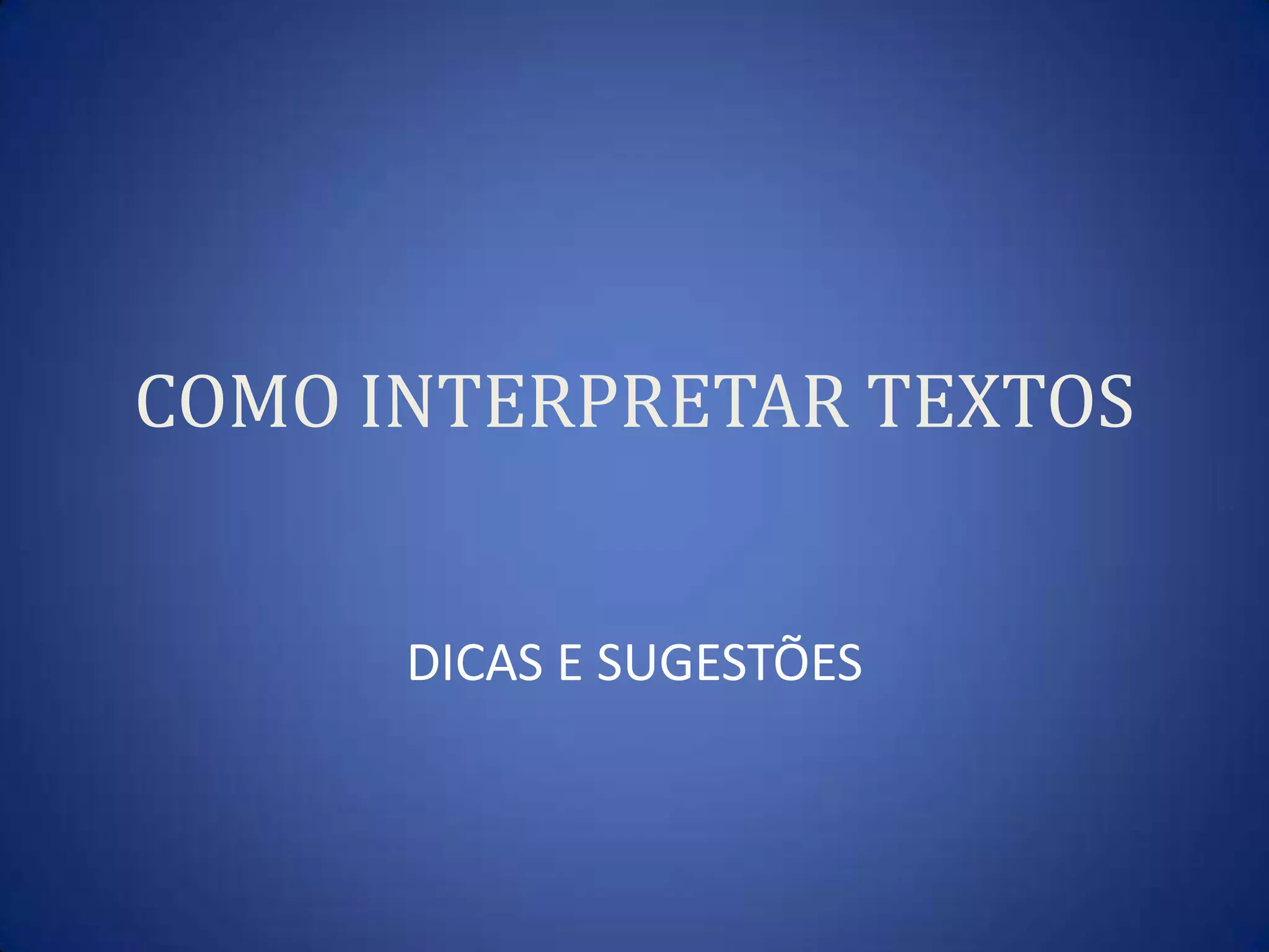 O documento fornece dicas para interpretar textos de forma correta, destacando a importância de prestar atenção, buscar a resposta no próprio texto e entender o contexto e mensagem do autor.