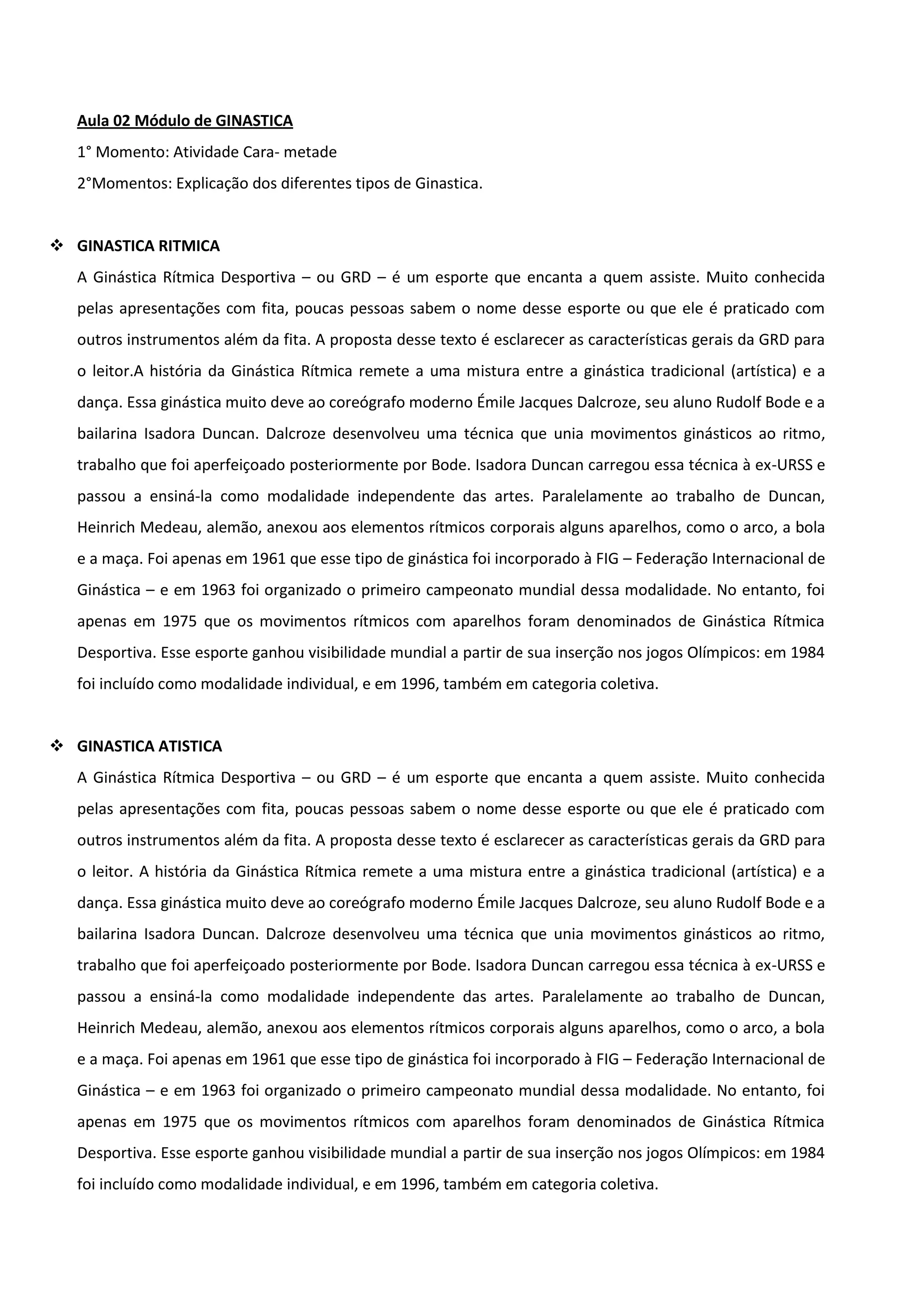 O documento descreve diferentes modalidades de ginástica, incluindo ginástica rítmica, artística, laboral, natural, aeróbica, geral e circense. A ginástica laboral é destacada como uma atividade física praticada no local de trabalho para prevenir doenças relacionadas ao trabalho e melhorar a produtividade.