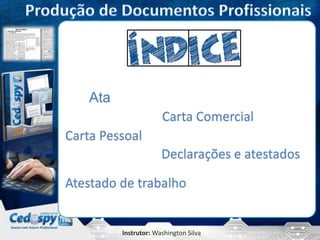 O documento fornece instruções sobre diferentes tipos de documentos formais e informais, incluindo atas, cartas comerciais, declarações, atestados e cartas pessoais. Ele também explica como selecionar texto no Microsoft Word e verificar a ortografia e gramática.