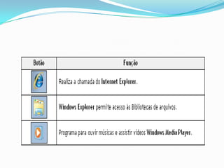 O documento discute as seguintes propriedades e elementos do Windows 7: