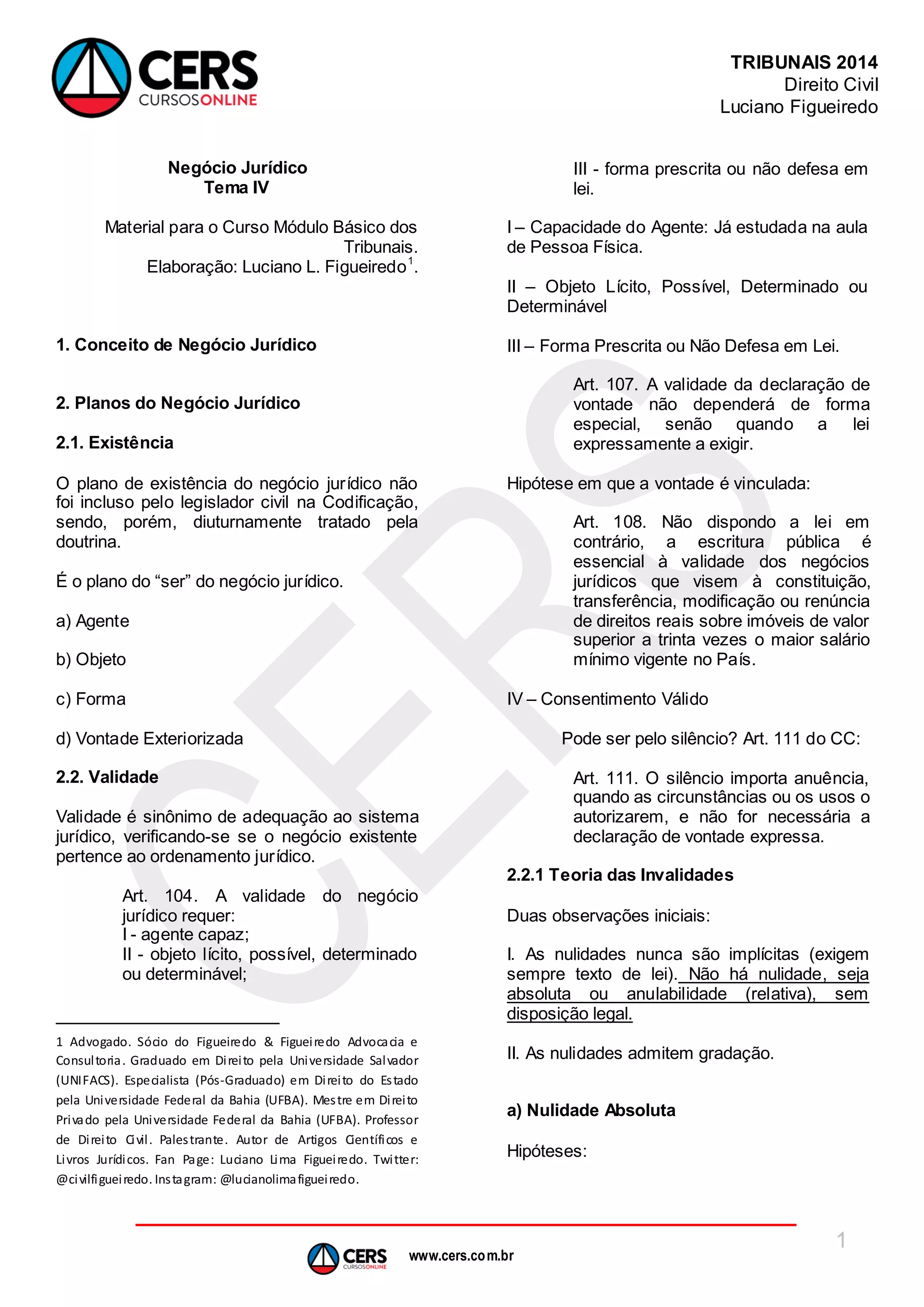 O documento discute os conceitos e planos do negócio jurídico de acordo com o Código Civil brasileiro. Aborda a existência, validade e eficácia do negócio jurídico, incluindo agente, objeto, forma, condição, nulidade absoluta, nulidade relativa e princípio da conservação. Fornece exemplos e cita artigos relevantes do Código Civil para explicar esses conceitos e planos.
