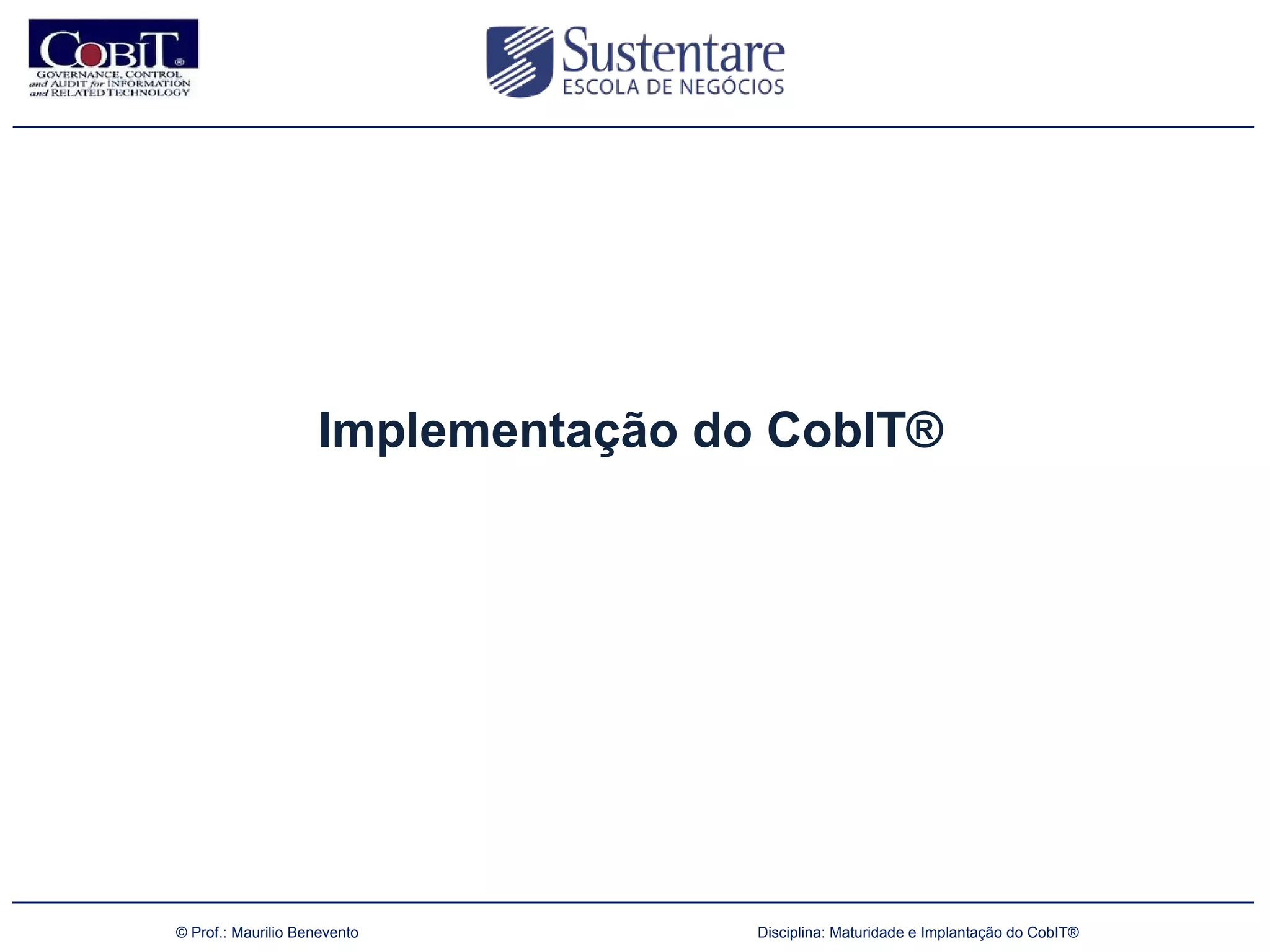 O documento aborda a implementação do COBIT e frameworks de governança, ressaltando sua importância na gestão de TI e na integração com objetivos de negócios. Ele descreve as fases de implementação da governança de TI, abordando desde a identificação de necessidades até a implementação de soluções e monitoramento de desempenho. Também discute metodologias como Balanced Scorecard e modelos de referência para serviços de TI, enfatizando a importância da governança corporativa.