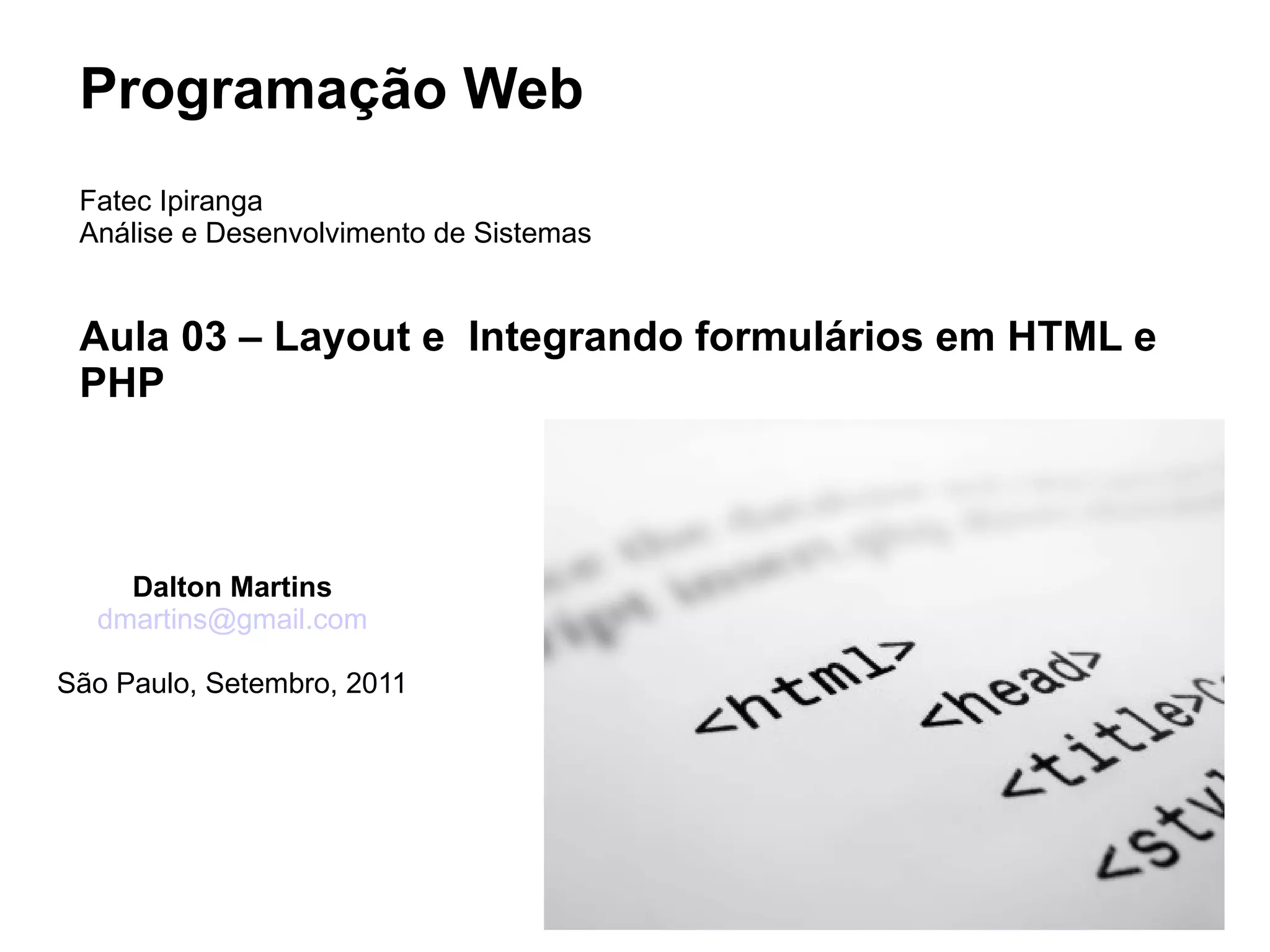 Este documento apresenta como construir formulários em HTML e PHP: (1) mostra os principais elementos de formulário como campos de texto, caixas de opção e lista; (2) explica como integrar formulários em páginas PHP; e (3) fornece exemplos de layout para integrar formulários em sites. O exercício final pede para criar um site com três formulários usando esses conceitos.