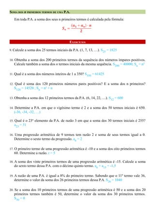 O documento descreve interpolação aritmética, que envolve inserir termos adicionais em uma progressão aritmética de forma a manter a mesma razão entre os termos. Ele fornece exemplos e fórmulas para calcular a razão e os termos adicionais necessários para interpolar entre dois números extremos dados. O documento também apresenta fórmulas para calcular a soma dos n primeiros termos de uma progressão aritmética.