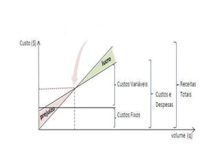 O documento fornece informações sobre administração de custos, incluindo procedimentos para determinar lucro ou prejuízo de uma pequena empresa, como controlar estoques, calcular depreciação e encargos sobre salários. Também discute ponto de equilíbrio, margem de contribuição, margem de segurança e formação de preços usando mark-up.
