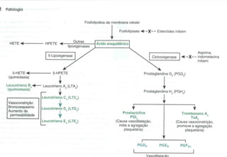 O documento discute os aspectos-chave da resposta imune e da inflamação. A resposta imune pode ser adaptativa (específica) ou inata (inespecífica). A inflamação é mediada por diversos fatores solúveis que interagem para recrutar células e reparar tecidos lesados. Os mediadores inflamatórios incluem aminas, citocinas, prostaglandinas e outros fatores químicos.