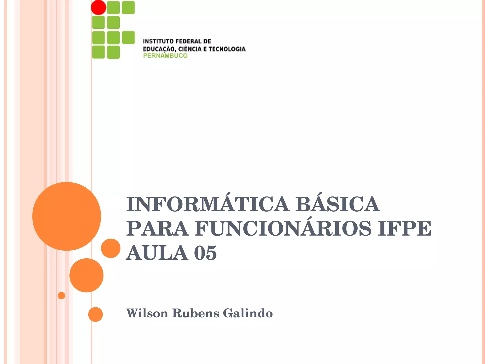Este documento apresenta os tópicos da Aula 05 de um curso de Informática Básica para Funcionários IFPE. Os tópicos incluem o que é aterramento, como funciona, filtros de linha, estabilizadores, módulos isoladores, no-break e aterramento eletrônico. O documento explica porque o aterramento é importante para proteger dispositivos eletrônicos e compara as vantagens e desvantagens de diferentes tipos de proteção.