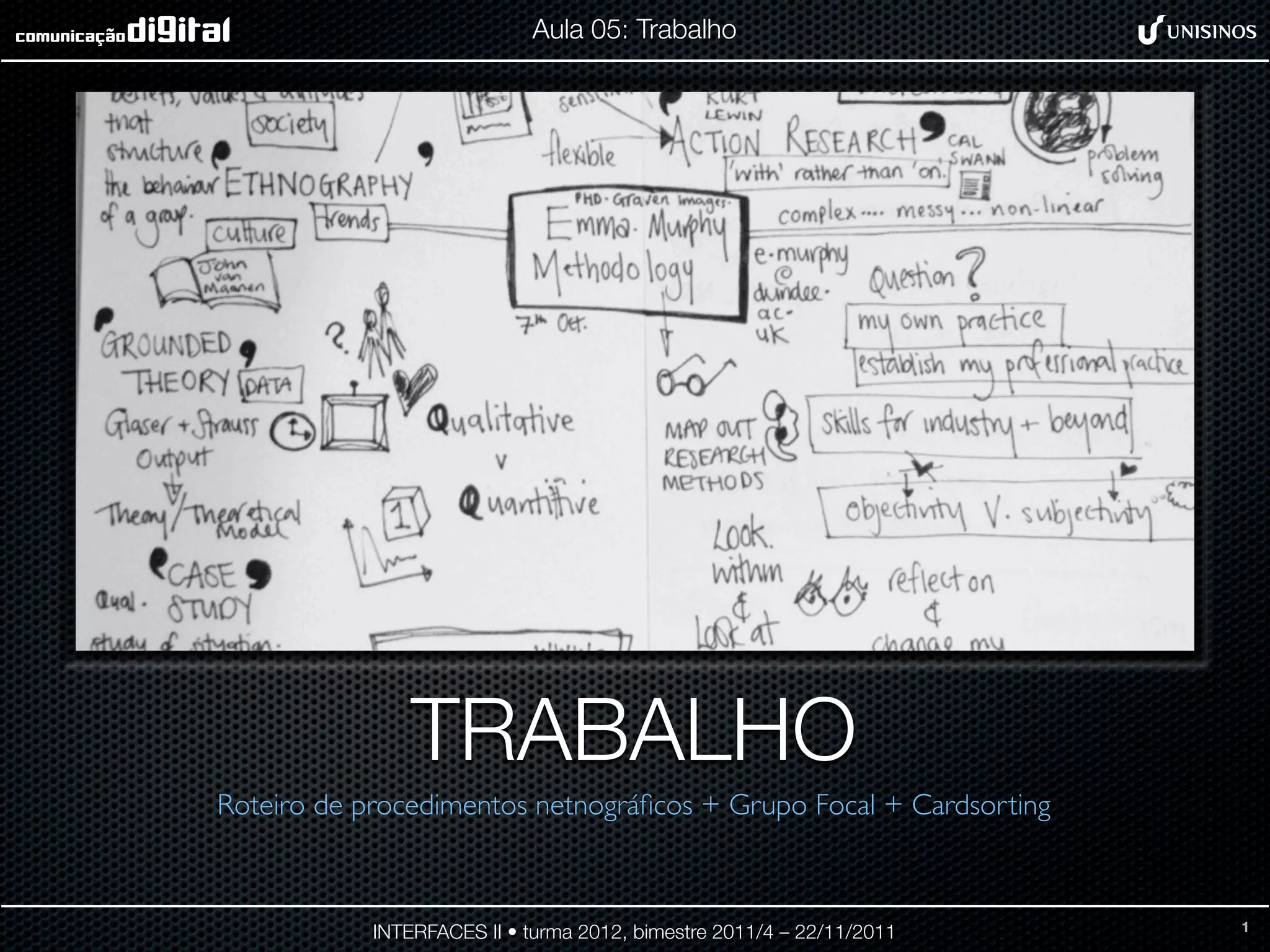 O documento fornece instruções para a aplicação de técnicas de pesquisa como grupos focais, cardsorting e observação netnográfica para redefinir a arquitetura de um site. Os alunos devem conduzir grupos focais e cardsorting, observar o comportamento dos usuários no site, e apresentar referências semelhantes e alterações na proposta inicial do projeto.