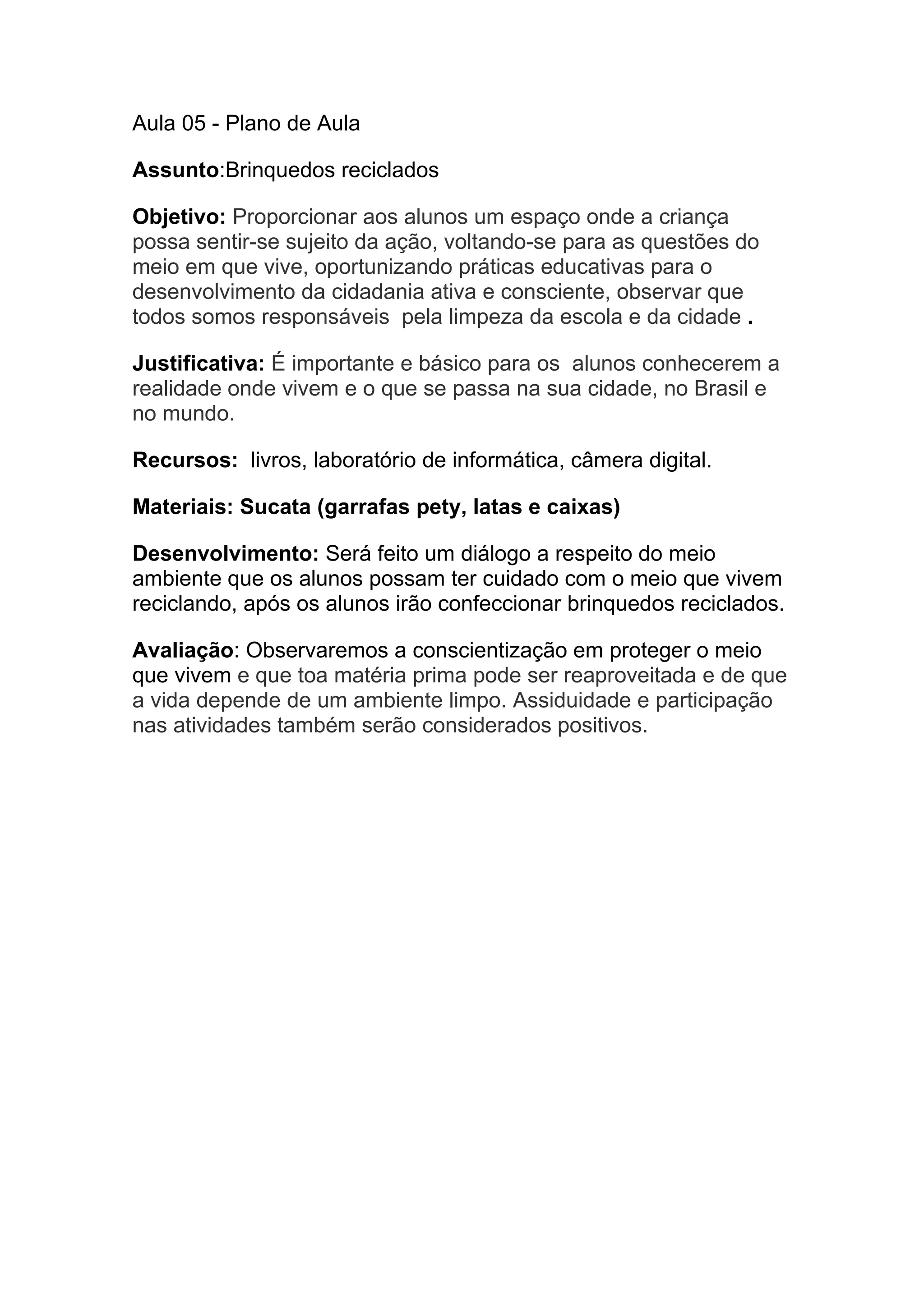 Este plano de aula tem como objetivo proporcionar aos alunos um espaço para desenvolver a cidadania ativa e consciência ambiental, ensinando-os a reciclar materiais como garrafas PET, latas e caixas para confeccionar brinquedos reciclados, e observando sua conscientização em proteger o meio ambiente.