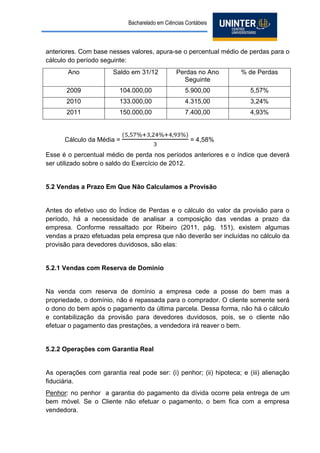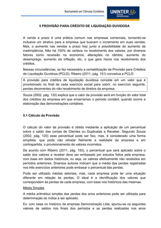 O documento descreve o cálculo e a contabilização da provisão para créditos de liquidação duvidosa. A provisão é calculada com base na média histórica de perdas em recebimentos e é registrada como despesa no resultado do período para cobrir possíveis perdas futuras. Quando créditos efetivamente se tornam incobráveis, faz-se o baixa contra a provisão ou resultado, dependendo do saldo da provisão.