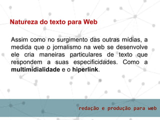 O documento discute as especificidades do jornalismo na web, incluindo a multimídia, hiperlinks e diferentes tipos de conteúdo. Também fornece dicas sobre redação para o meio digital, como escrever textos concisos e usar links de forma clara.