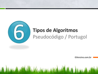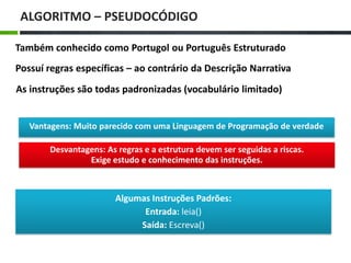 O documento descreve três tipos de algoritmos: pseudocódigo/Portugol, fluxograma/diagrama de blocos e compara suas características. O pseudocódigo possui regras específicas e vocabulário limitado, se assemelhando a linguagens de programação. Já o fluxograma representa o fluxo de execução de forma gráfica. Exemplos em pseudocódigo ilustram a soma de três números e cálculo da média de notas com decisão.