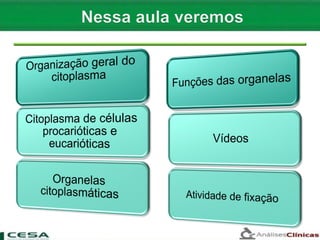 O citoplasma é formado pelo citosol e organelas. Nas células procarióticas, todo o espaço celular é citoplasma. Nas eucarióticas, o citoplasma está entre a membrana plasmática e o envelope nuclear, contendo organelas como o retículo endoplasmático, complexo de Golgi, lisossomos e peroxissomos. Estas organelas desempenham funções vitais como síntese de proteínas, modificação e transporte de substâncias, digestão e oxidação.