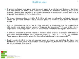 O documento descreve os principais comandos e diretórios do Linux. Ele inclui uma introdução à estrutura de diretórios do Linux e lista os principais diretórios como /bin, /boot, /dev, /etc, /home e outros. O documento também explica comandos básicos para navegação, manipulação de arquivos e pastas, gerenciamento de usuários e grupos e fornece informações sobre o sistema.