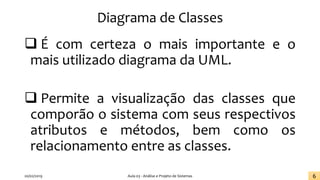 O documento discute diagramas de classes no contexto de análise e projeto de sistemas. Explica que diagramas de classes mostram as classes, atributos, métodos e relacionamentos de um sistema de forma estática. Também discute conceitos como classes, atributos, métodos, relacionamentos, herança e agregação.