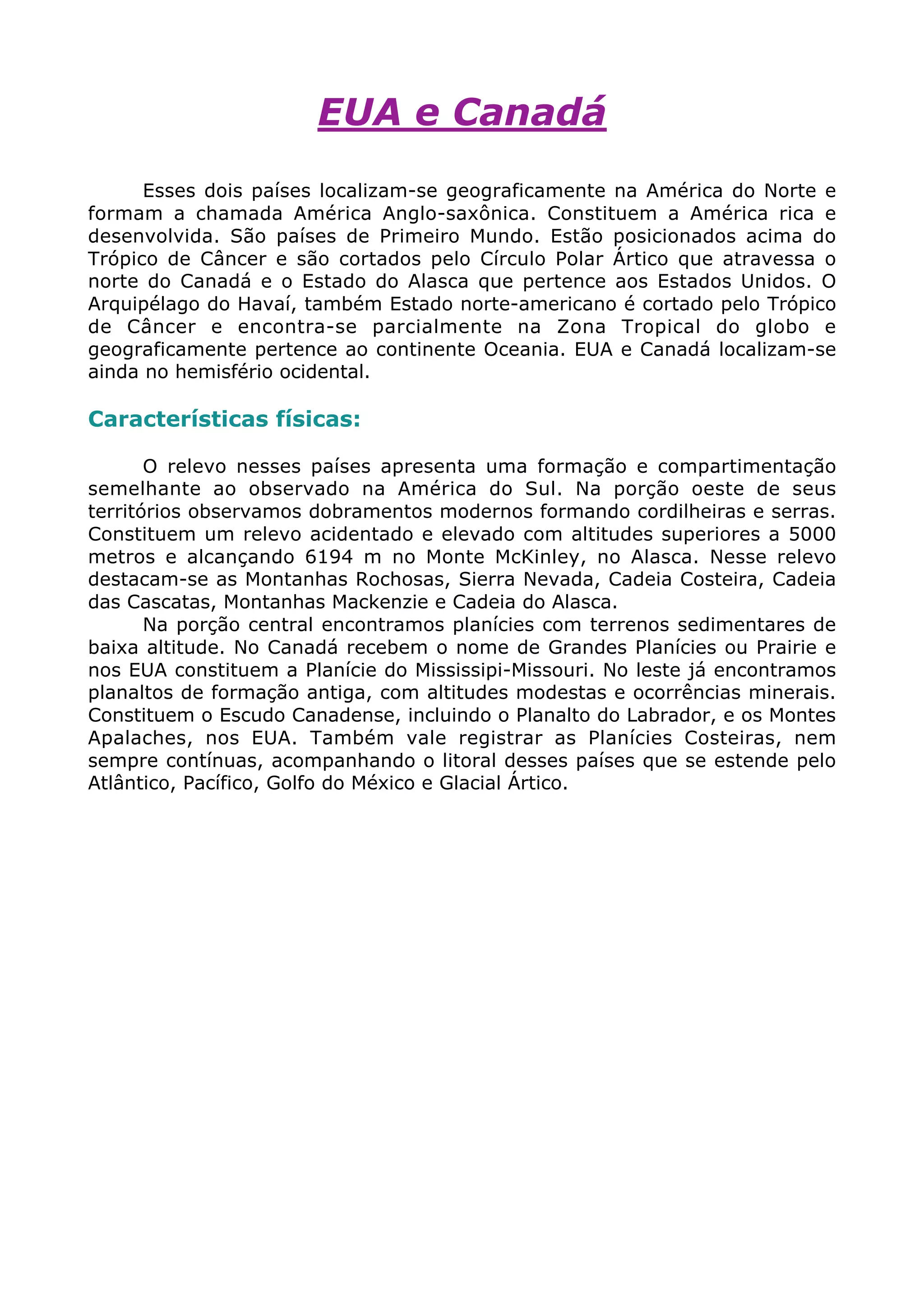 Este documento descreve as características geográficas, climáticas, econômicas e demográficas dos EUA e Canadá. Apresenta informações sobre o relevo, hidrografia, clima, composição étnica, atividades econômicas, distribuição populacional e cidades principais dos dois países.