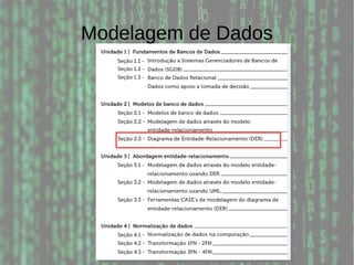 O documento apresenta um curso sobre modelagem de dados, incluindo a criação de modelos conceituais e lógicos de bancos de dados. Os alunos deverão desenvolver esses modelos como exercício prático para diferentes sistemas, como ambiental, telefonia, e-commerce e saúde.