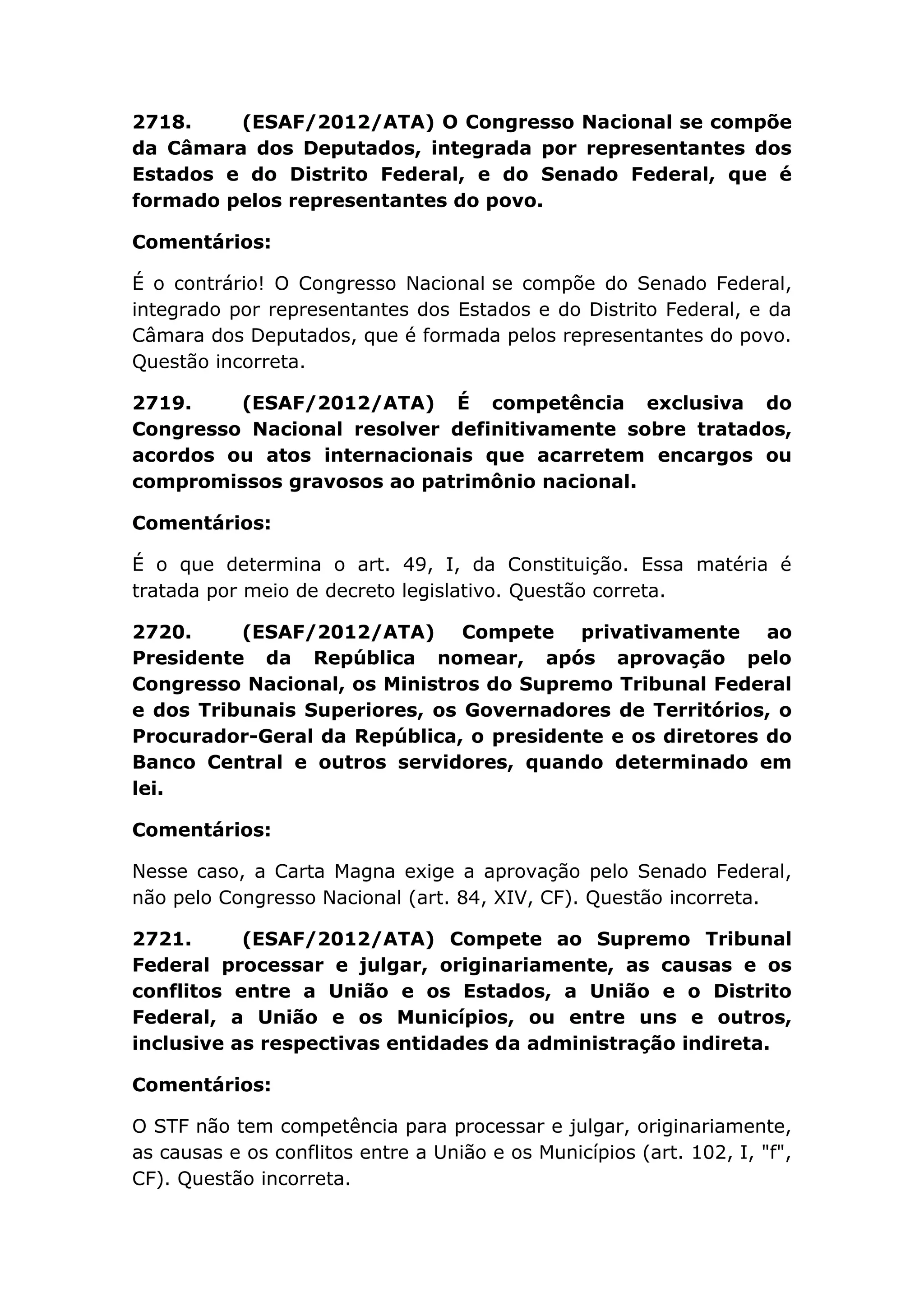 O documento apresenta uma série de questões e comentários sobre direito constitucional brasileiro. As questões tratam de temas como a composição do Congresso Nacional, competências do Presidente, Poderes da República, direitos e garantias fundamentais e nacionalidade. Os comentários analisam se as questões estão corretas ou incorretas de acordo com a Constituição Federal.