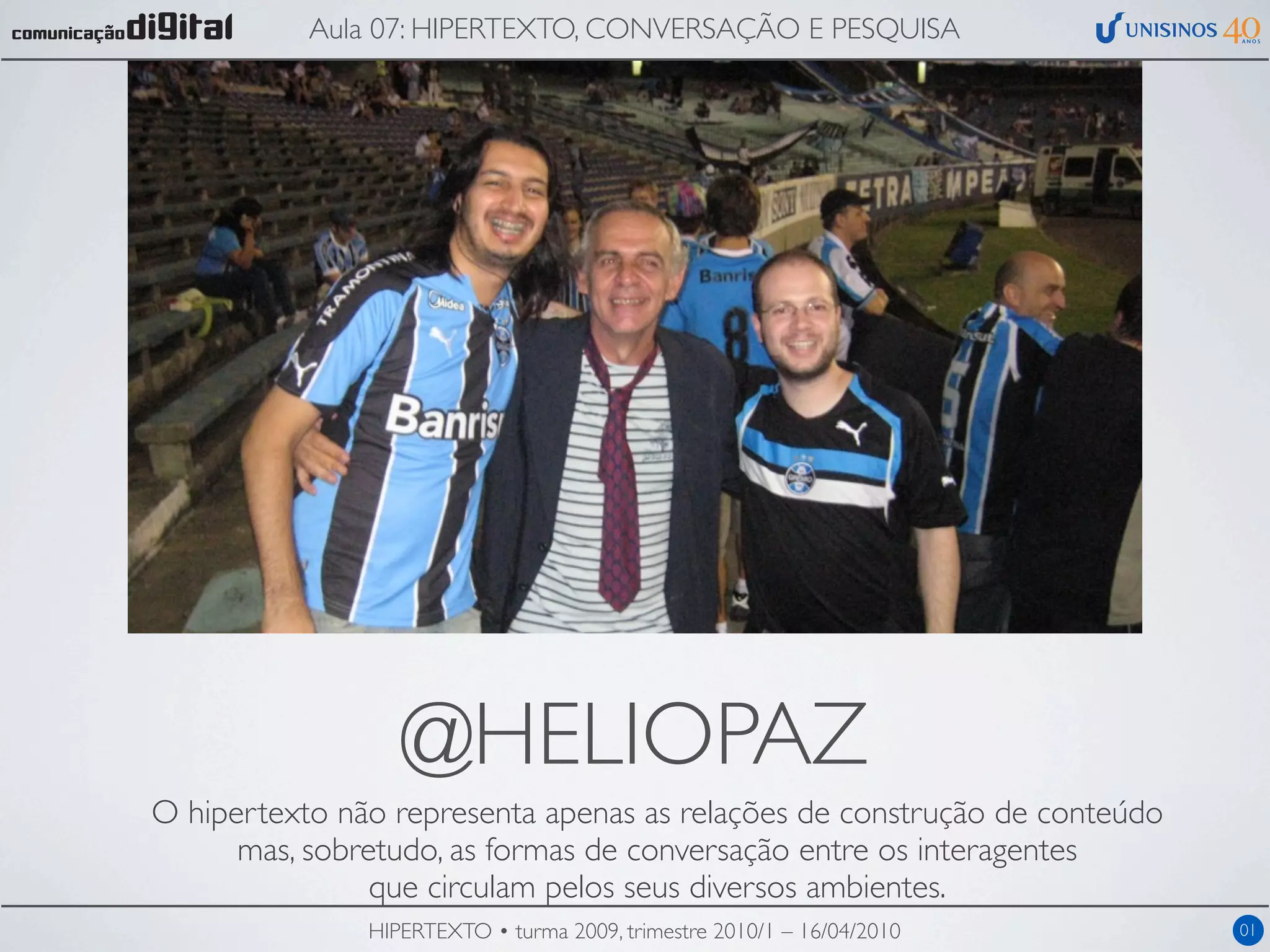 O documento discute blogs como espaços de conversação e pesquisa. Ele explica que blogs permitem interações escritas e assíncronas e diferentes ambientes dentro de um blog podem proporcionar tipos diferentes de interação. Ele também discute decisões importantes para pesquisas sobre blogs, como escolher blogs para análise e combinar métodos online e offline.