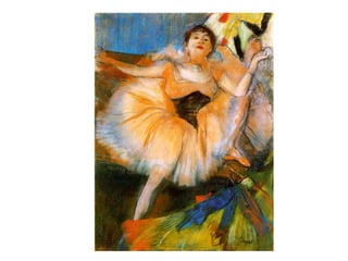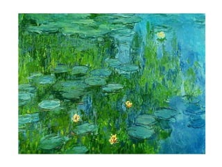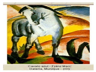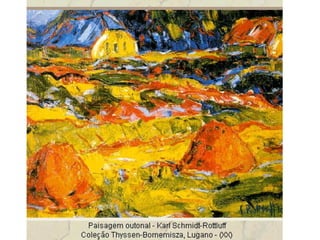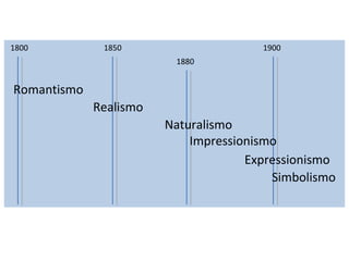 O documento resume as principais correntes artísticas entre 1800 e início de 1900: Romantismo, Realismo, Naturalismo, Impressionismo, Expressionismo e Simbolismo. Apresenta as características e principais artistas de cada movimento, mostrando como eles se influenciaram ao longo do tempo e evoluíram uns aos outros.