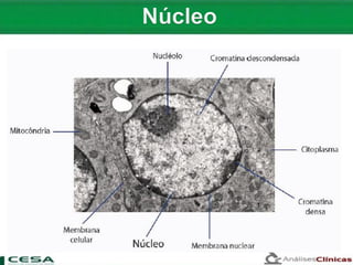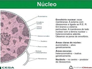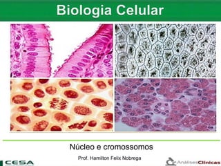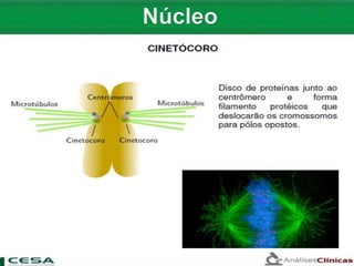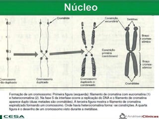 O documento descreve as principais características do núcleo celular e dos cromossomos. O núcleo contém o material genético da célula na forma de cromatina e é responsável pela coordenação das atividades celulares. Os cromossomos, encontrados no núcleo, carregam os genes na forma de DNA e sofrem processos como a mitose e a meiose para a divisão celular.
