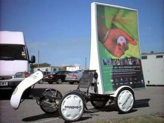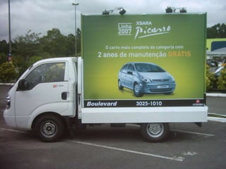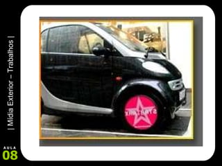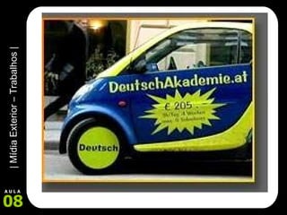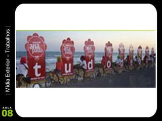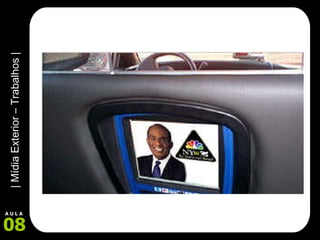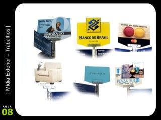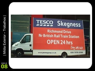Este documento apresenta detalhes sobre uma aula sobre mídia exterior, incluindo o plano de aula, métodos de avaliação e tópicos a serem discutidos. A aula 08 irá apresentar e julgar trabalhos dos alunos. Vários formatos de mídia exterior são descritos, como placas de rua, mídia em táxis, caminhões e bicicletas.