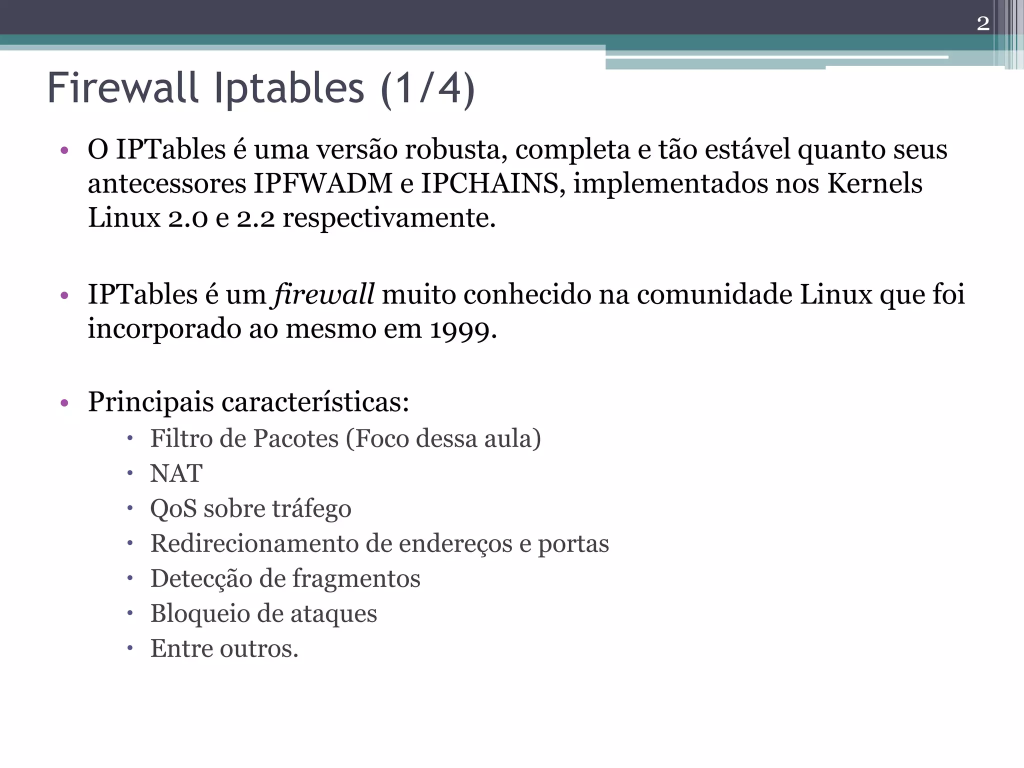 O documento resume as principais características e funcionalidades do firewall Iptables no Linux. Em especial, descreve como o Iptables funciona com regras para filtrar pacotes de rede de acordo com origem, destino, protocolo e portas. Também explica os principais comandos para manipular as chains de regras e definir ações como aceitar, rejeitar ou redirecionar pacotes.