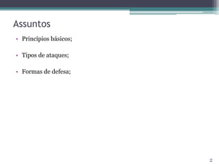 O documento discute princípios de segurança na internet, incluindo como a internet foi projetada inicialmente sem considerar segurança e como os ataques se tornaram mais sofisticados ao longo do tempo. Também descreve vários tipos de ataques como negação de serviço, exploração de bugs e protocolos, e mecanismos de defesa como criptografia e filtros de pacotes.