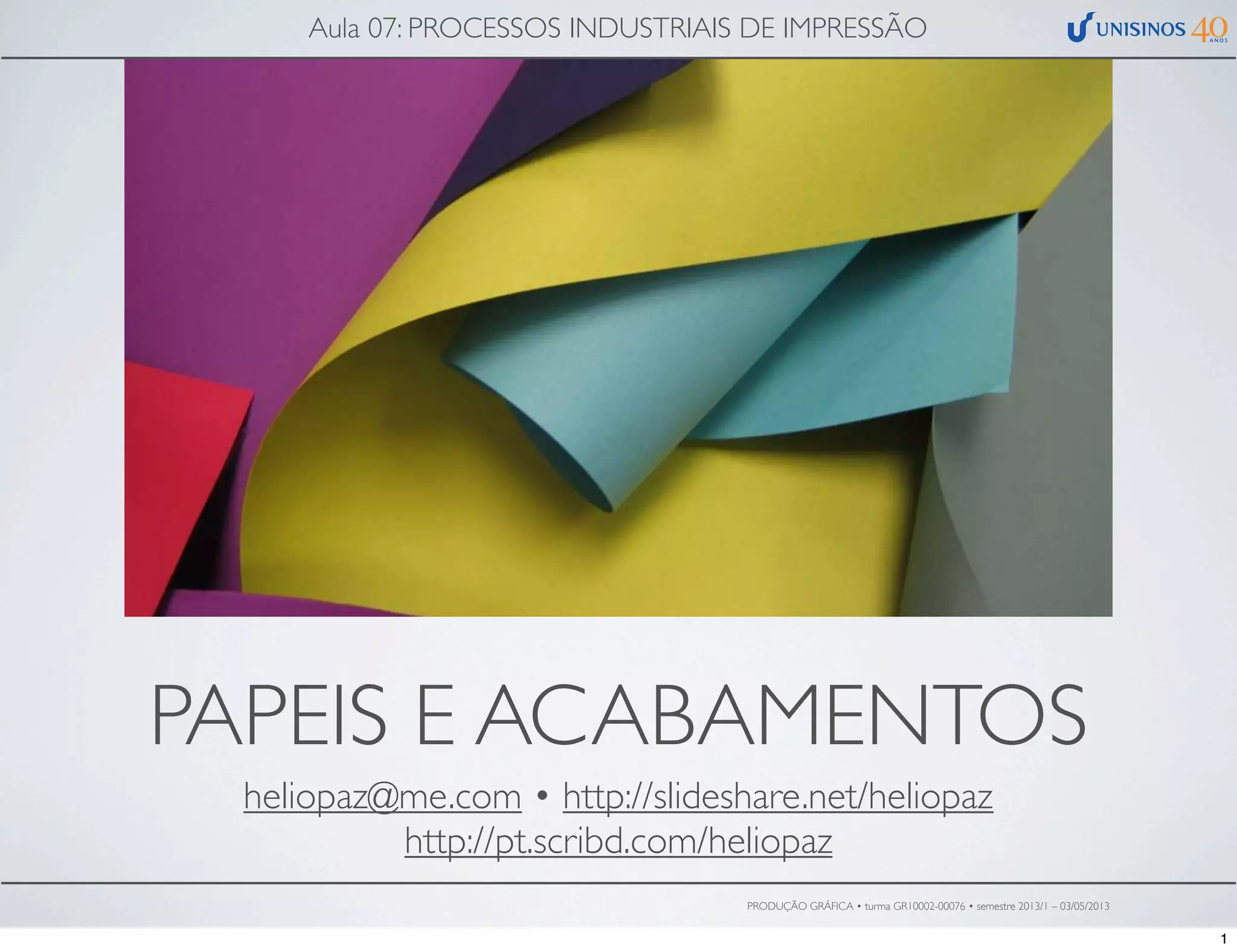 O documento descreve os principais tipos de papel utilizados na produção gráfica, incluindo offset, jornal, couchê, supremo e reciclado. Também explica acabamentos comuns como laminação, verniz e vinco/dobra, além de apresentar vídeos demonstrativos desses processos. Por fim, relaciona gramaturas típicas de papel a seus usos mais comuns.