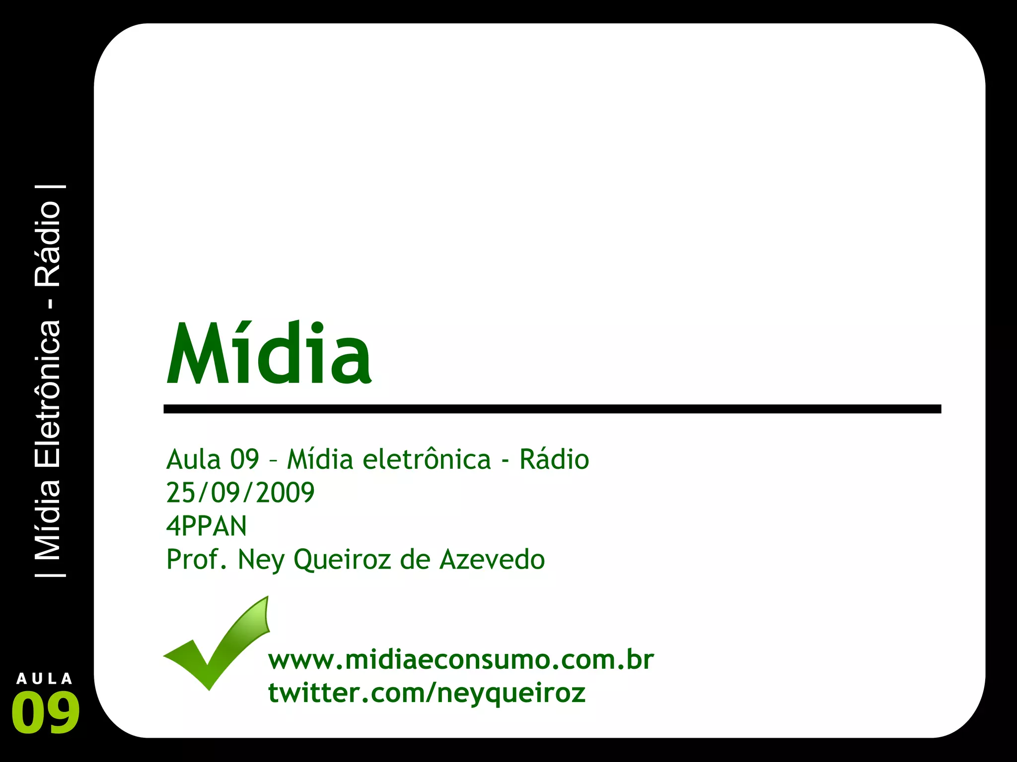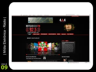 Este documento fornece informações sobre a história da rádio, seu desenvolvimento e aspectos comerciais. Resume a invenção das ondas de rádio no século 19, o pioneirismo de Marconi na criação da primeira estação de rádio e o crescimento do rádio como meio de comunicação na década de 1920. Também aborda características da rádio FM e AM e horários nobres para veiculação de publicidade.