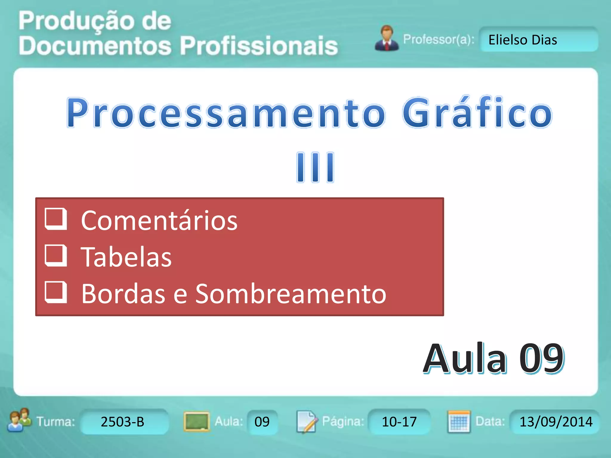 O documento discute comentários, tabelas e formatação de bordas e sombreamento em tabelas no Word. Explica o que são comentários e como inseri-los, como criar tabelas e formatá-las, incluindo mesclar células, adicionar sombreamento e personalizar bordas.