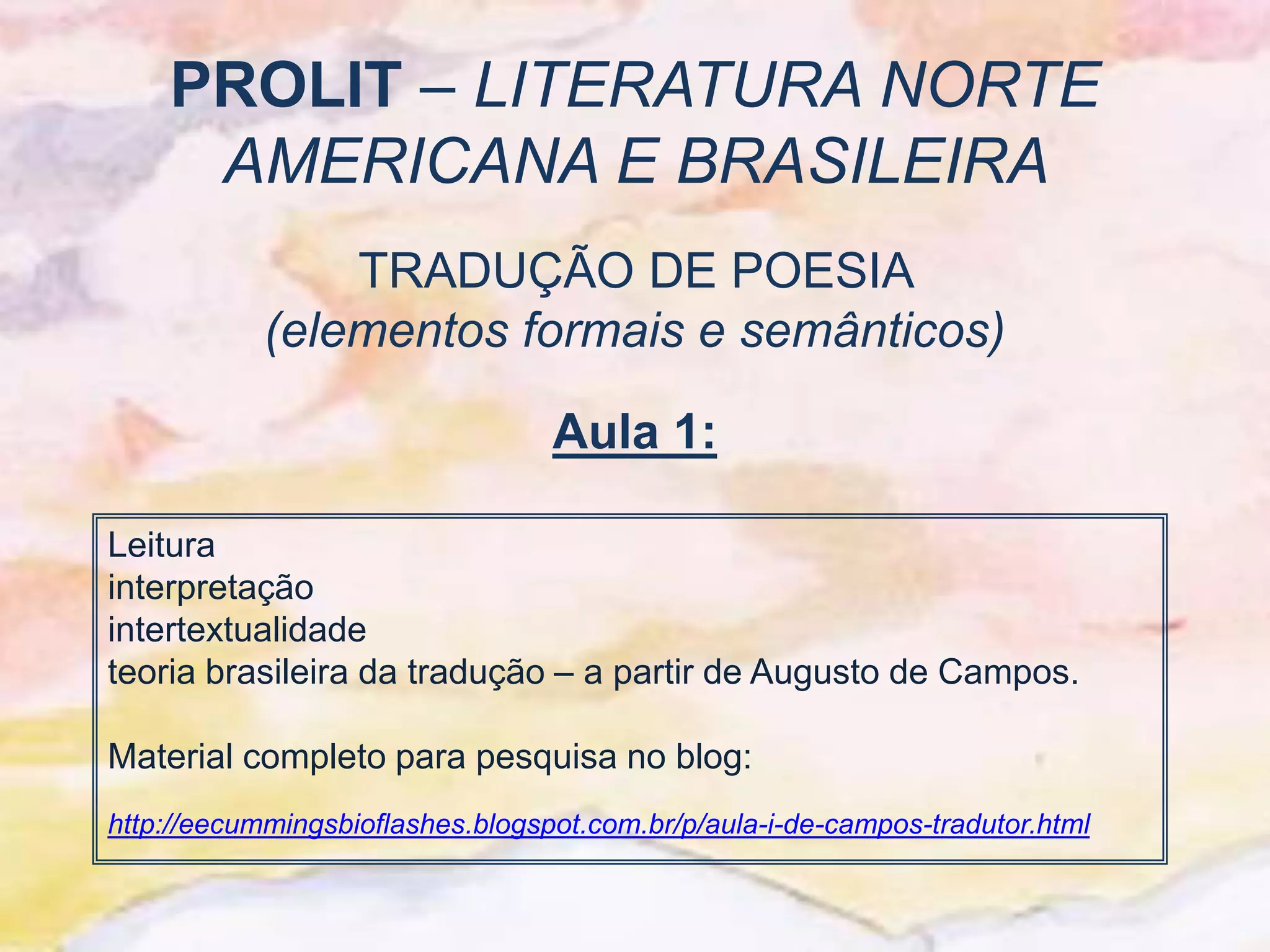 Este documento apresenta uma aula sobre tradução de poesia de Augusto de Campos, incluindo leitura, interpretação e intertextualidade. A aula discute a teoria brasileira da tradução com foco em Augusto de Campos e apresenta poemas e vídeos sobre o poeta e a tradução. Os alunos são encarregados de pesquisar sobre o poeta E.E. Cummings para a próxima aula.