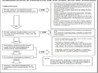 Este documento discute doenças diarreicas, incluindo suas principais causas, sinais e sintomas, classificação, agentes etiológicos, avaliação e tratamento. É fornecido um plano de tratamento de acordo com o grau de desidratação e um caso clínico exemplificando a avaliação e manejo de uma criança com diarréia persistente.
