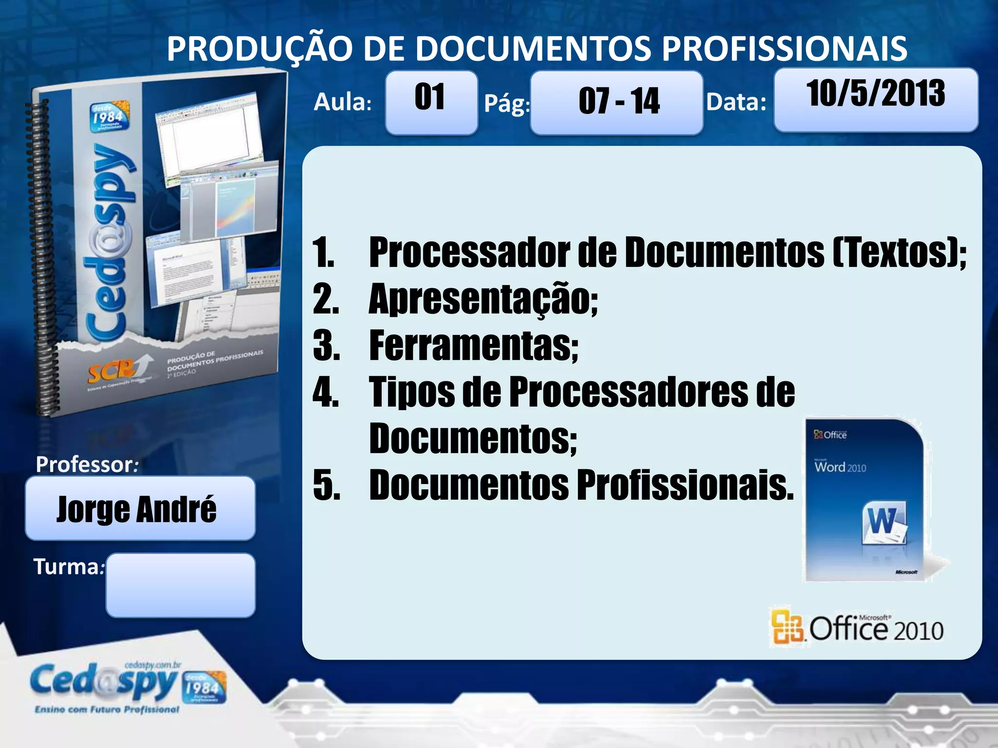 O documento discute processadores de texto e documentos profissionais. Ele define processadores de texto como aplicativos para criar, editar e formatar documentos e lista exemplos como Microsoft Word e LibreOffice Writer. O documento também descreve diferentes tipos de documentos profissionais como memorandos, ofícios e atas.